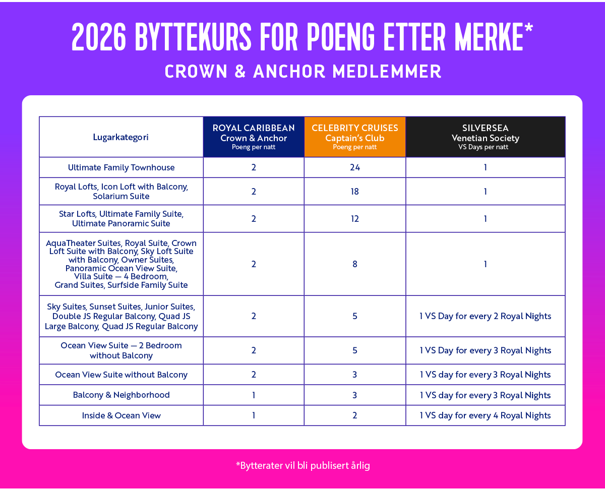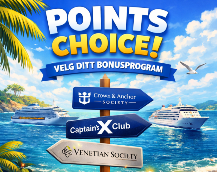 Nå blir det derimot enklere, for når som helst før ditt neste cruise, og opptil 14 dager etter, kan du velge hvilket program du ønsker å tjene opp poeng (og status) i. Da de forskjellige programmene – Crown & Anchor, Captain’s club og Venetian Society – har litt forskjellige systemer, må poengene oversettes mellom rederiene. Det ble i dag publisert tabeller som viser hvordan dette vil se ut.