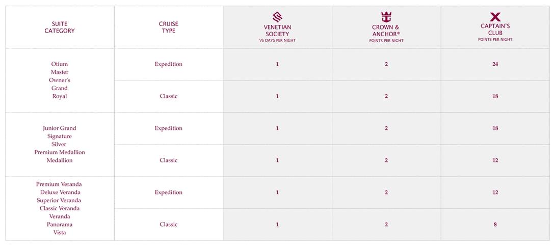 I bunn og grunn er 1 natt hos et rederi tilsvarende 1 natt hos et annet rederi, innenfor tilsvarende kategori. Så 1 natt i balkong tilsvarer 1 natt i balkong på tvers av Royal Caribbean og Celebrity. Silversea har kun suiter så her blir det annerledes, men også lavere nivåkategorier hos Royal Caribbean og Celebrity vil gi deg delvis poeng hos Silversea.