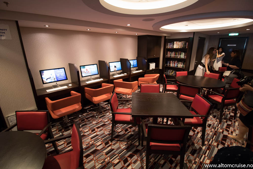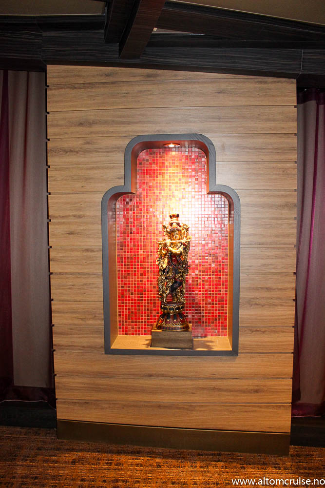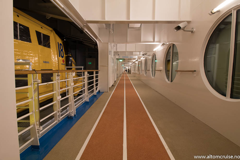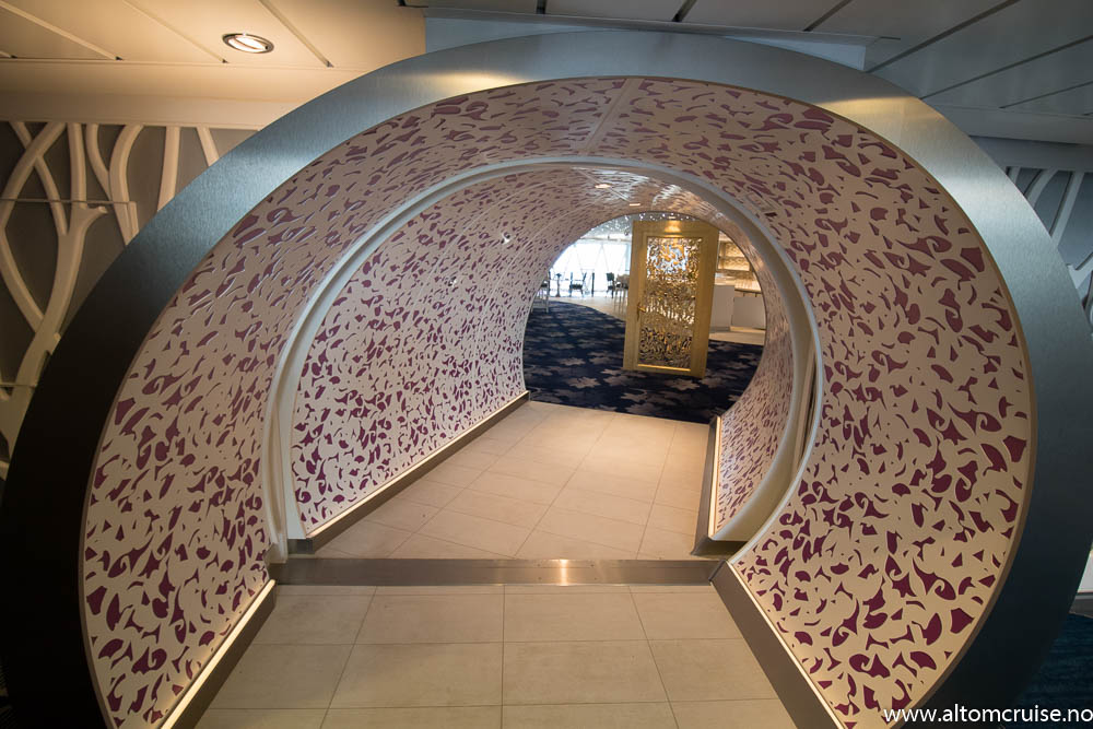 Først er det generatorene. Det er flere forskjellige generatorer ombord, som med sine forskjellige størrelser kan kjøres for å tilpasses det aktuelle energibehovet der og da. Utslippet fra generatorene blir i tillegg skrubbet av avgassrensere og restvarme blir hentet ut for å varme opp vann. Her er det uten tvil tenkt på at energien skal hentes ut og gjenbrukes flere ganger. En annen stor faktor er overgangen til LED-belysning. Så godt som all belysning i skipet er LED-basert, og selv om dette har en noe høyere investeringskost så tjener man fort inn dette både på lavere utskiftningskostnader, mindre strømforbruk, og ikke minst mindre tap av strøm til varme – som igjen betyr at man ikke trenger å kjøle ned like mye av skipet. Vi ble også fortalt at skipets strømforbruk hele tiden overvåkes og hvis noen har glemt å skru av noe på et av kjøkkenene så vil dette oppdages. Rett og slett og stort fokus på å spare strøm.