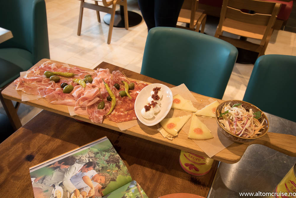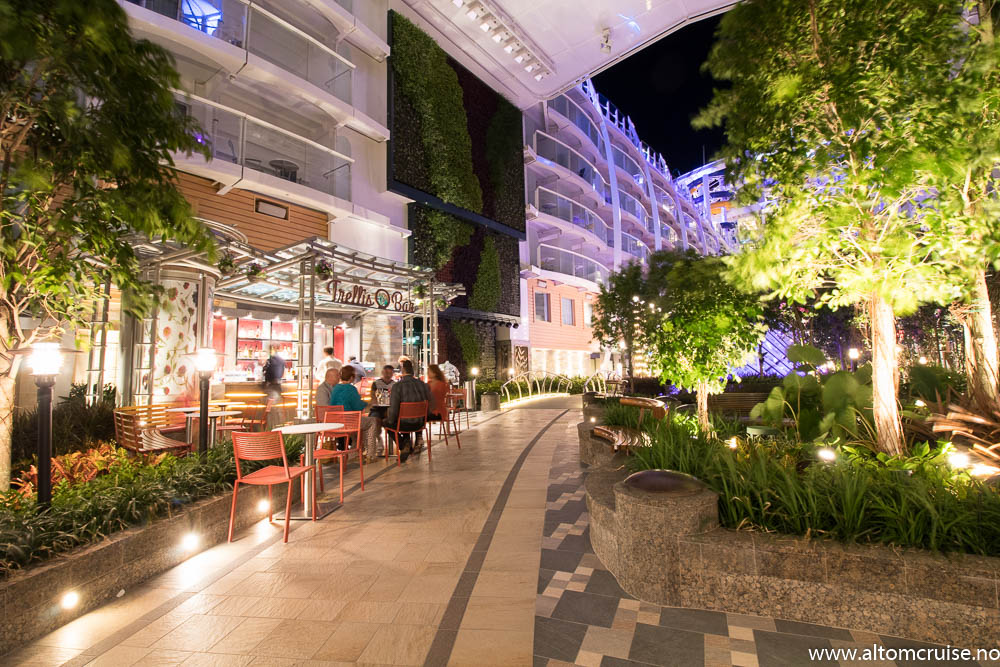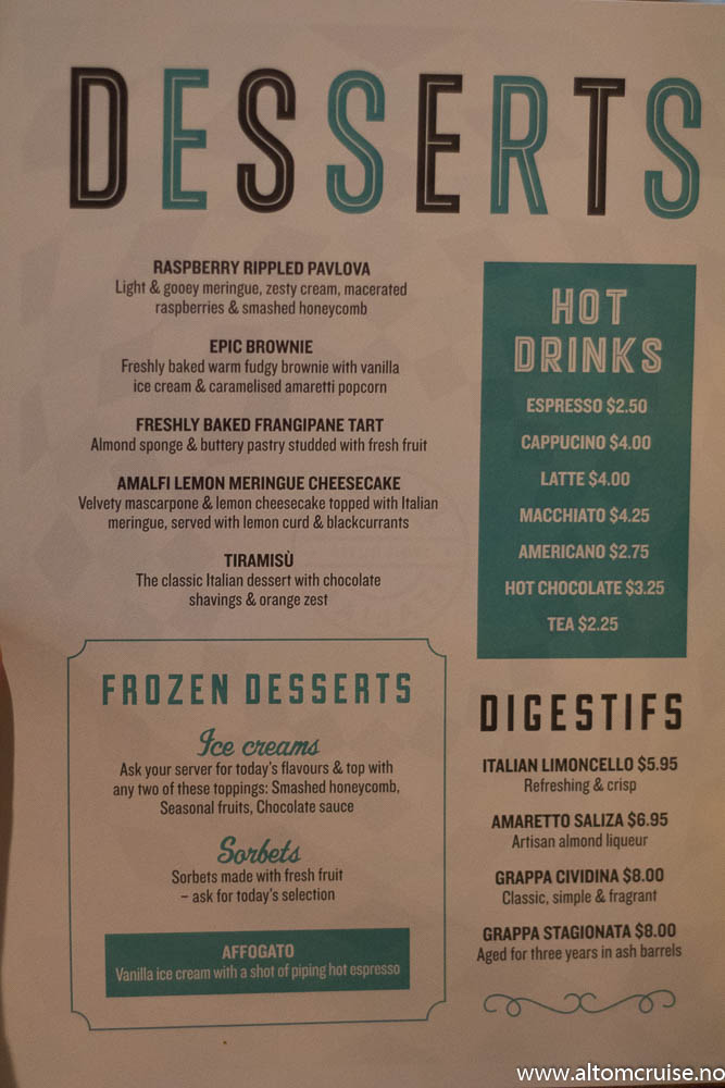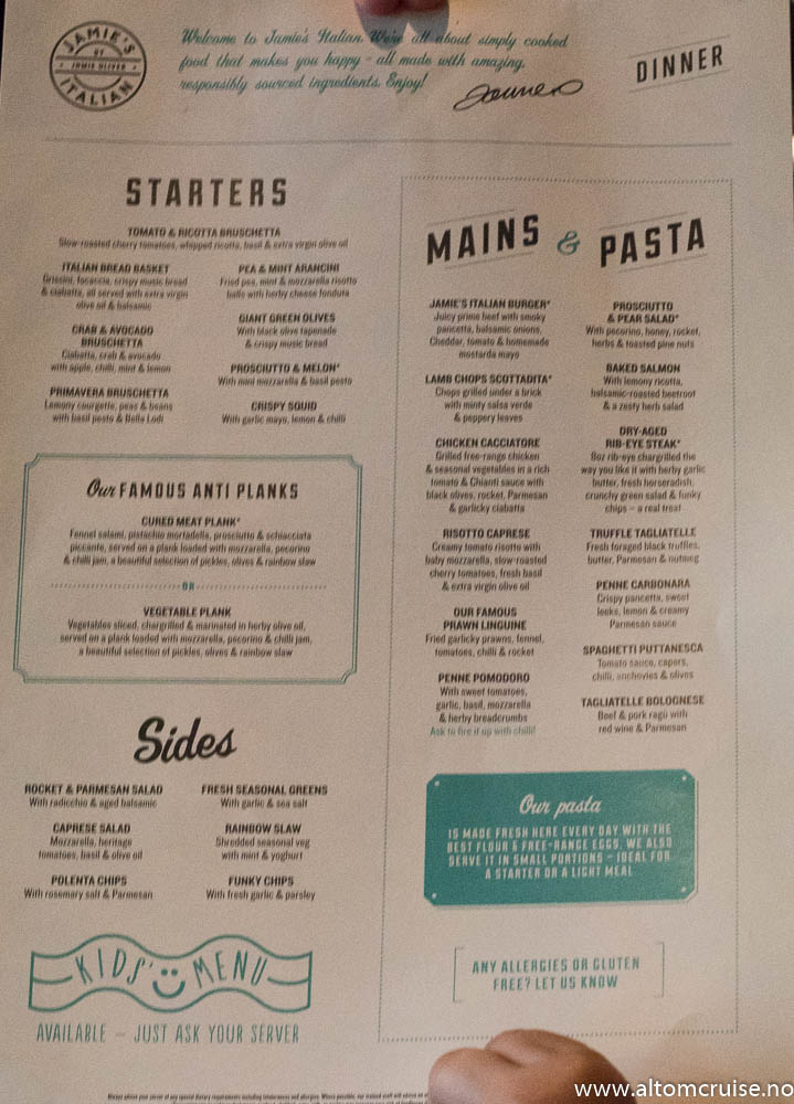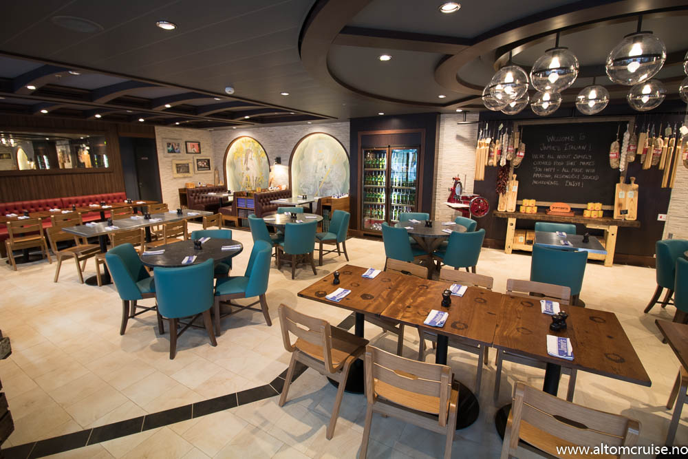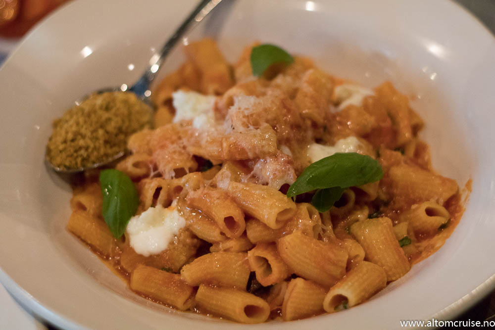 En av nyhetene ombord på Harmony er Jamie’s Italian. Vi testet middagen her og kan varmt anbefale å teste denne nyheten, selv om den koster $35 per hode for middag. Du finner restauranten i Central Park-nabolaget og dette er en familievennlig, atmosfærisk perle, som viser at italiensk er mer enn pizza og pasta. Porsjonene er rause, og med gode samarbeidspartnere så er kvaliteten på maten som serveres her høy. De lager sin egen pasta hver dag! Servitørene er også dyktige, for vår egen del en stor takk til Tamara for å ha lagt til rette kvelden vår.