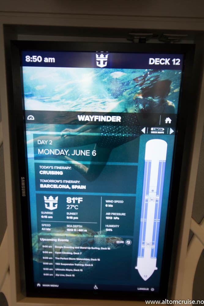 Hvis du tidligere har booket boardwalk balcony på Oasis eller Allure er du kanskje bekymret for at den nye sklien, The Abyss, tar opp mye av utsikten bakover mot Aqua Theatre. Vel, den tar opp noe, men det er fortsatt mulig å se havet bak. Da vi var der var det heller ikke merkbart mer støy som følge av sklien, så vi vil ikke fraråde boardwalk balcony på Harmony. Det vi derimot merket oss som litt negativt var at bordet på utvendig balkong nå var mindre og lavere enn vi kjenner fra Allure, så det kan bli en utfordring hvis du liker å spise frokost på balkongen. Ellers fremstår lugarene som oppgraderte og med en høyere kvalitetsfinish på badene og ellers.