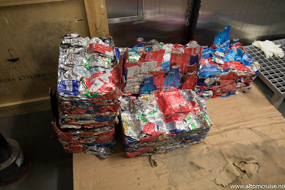 Plass er noe man aldri får nok av på et cruiseskip og dette påvirker også avfallshåndteringen. Glass knuses og legges i store sekker. Sekkene fra en av dagene vi var der utgjorde ca 3.5 tonn med glass. Metall komprimeres. Matavfall kvernes opp og blir til fiskefor, og noe brennes. Det som blir igjen blir samlet opp og returnert til gjenvinningsanlegg på land når skipet fyller på proviant. Alt i alt en meget effektiv avfallshåndtering.