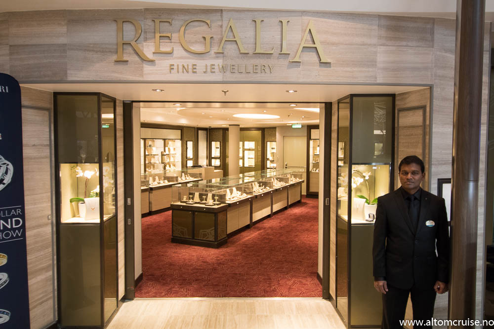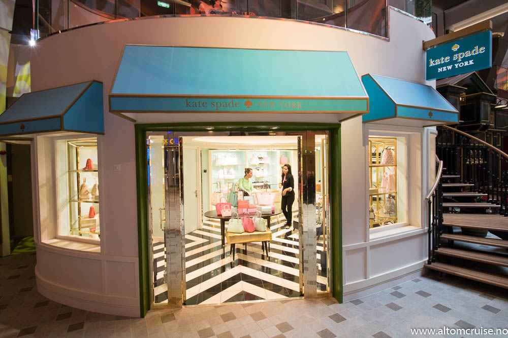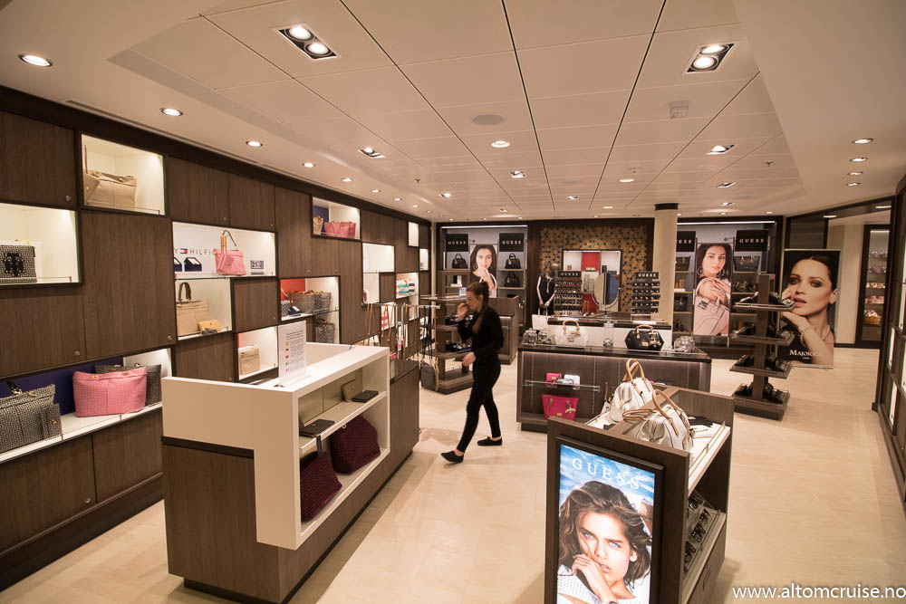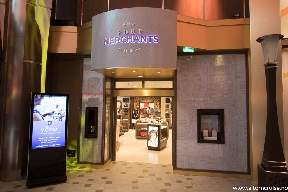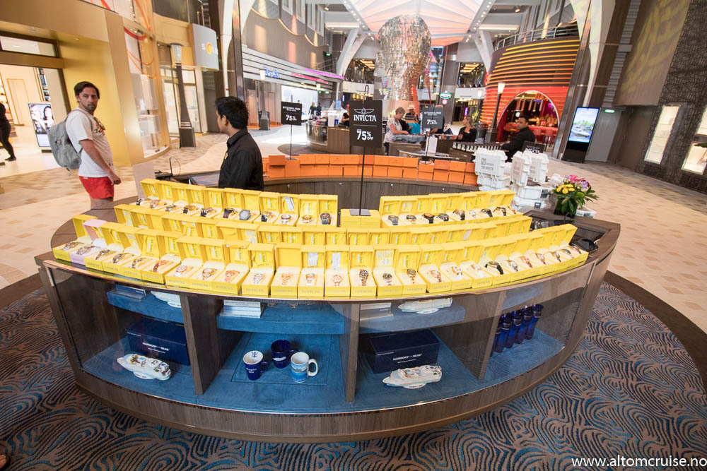 Hvis ikke det gigantiske casinoet tapper deg for alle pengene så er det flere butikker ombord hvor du kan gjøre en god handel. Både Central Park, Boardwalk og Royal Promenade har et utvalg av butikker hvor du kan finne deg klær, smykker, kosmetikk eller til og med ditt neste cruise. I midten av Royal Promenade har de et lite torg hvor det varierer hva som er til salgs. Her finner du gjerne noen ekstra tilbud i løpet av cruiset, så følg med i cruiseplanleggeren for å se hva som skjer. Noen av merkene du finner er Kate Spade New York, Fossil, Invicta, Bvlgari, Cartier og Tissot.