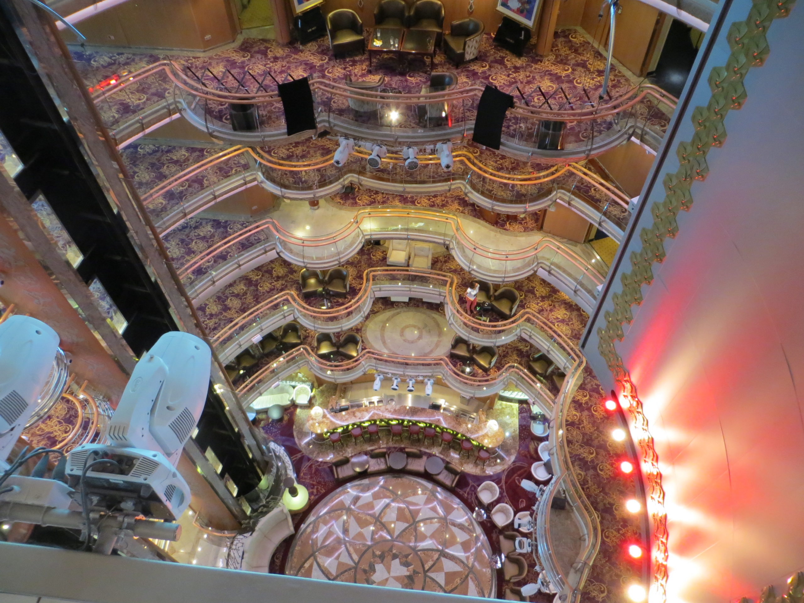 Første stopp er Viking Crown Lounge, en klassiker hos Royal Caribbean i toppen av skipet. Derifra har vi også fin utsikt utover mot hovedbassenget